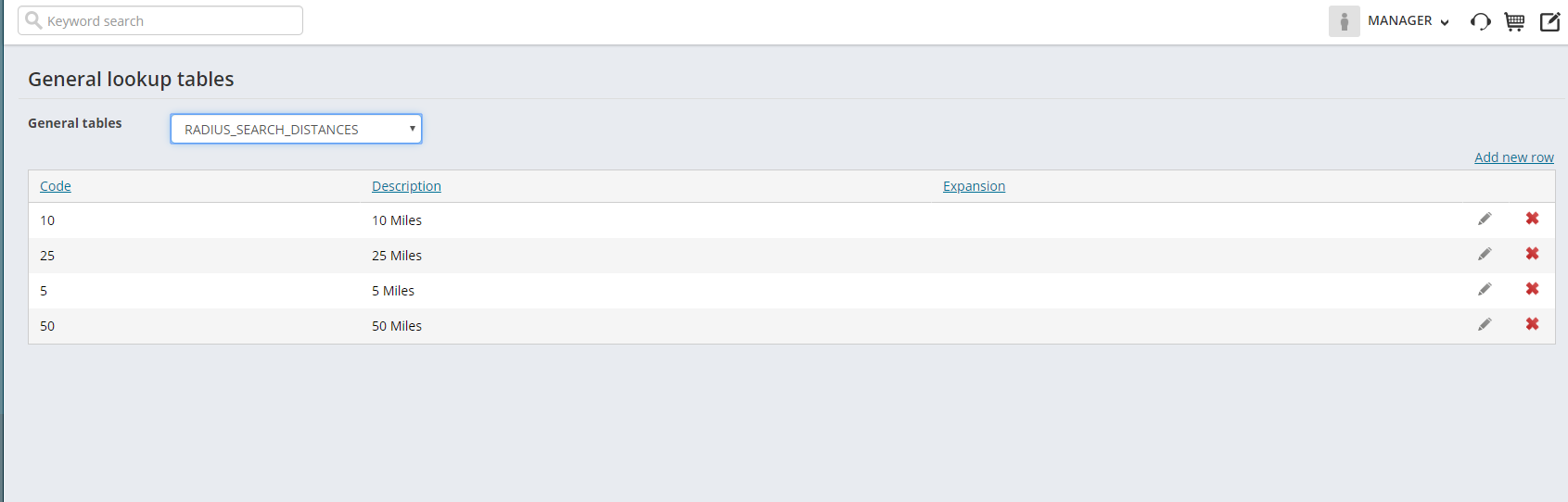 The screenshot below shows a sample GEN_TABLE for custom search distances. Code = the number of miles; Description = the corresponding number of miles described (i.e.: 10 Miles)