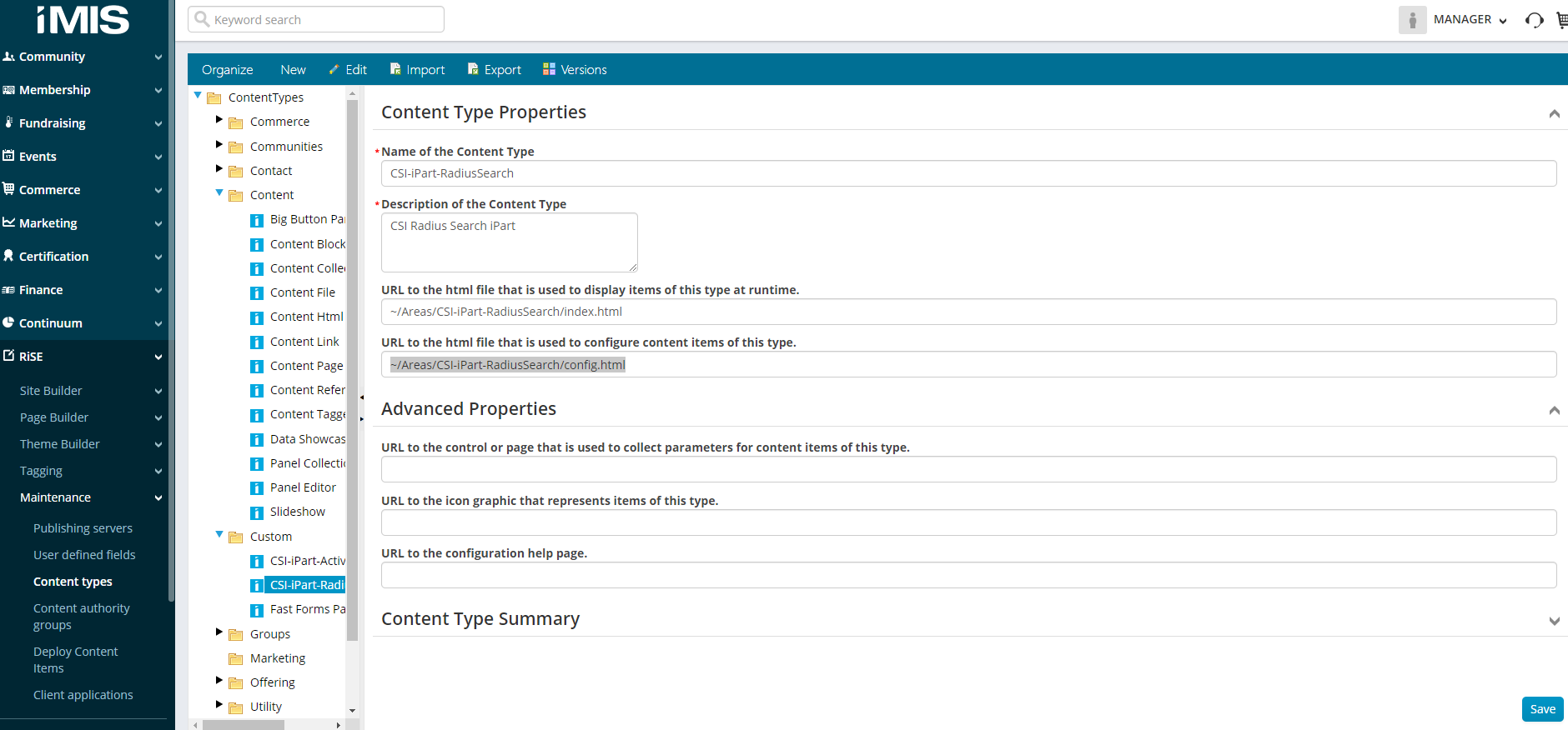 Navigate to the menu item RiSE > Maintenance > Content Types