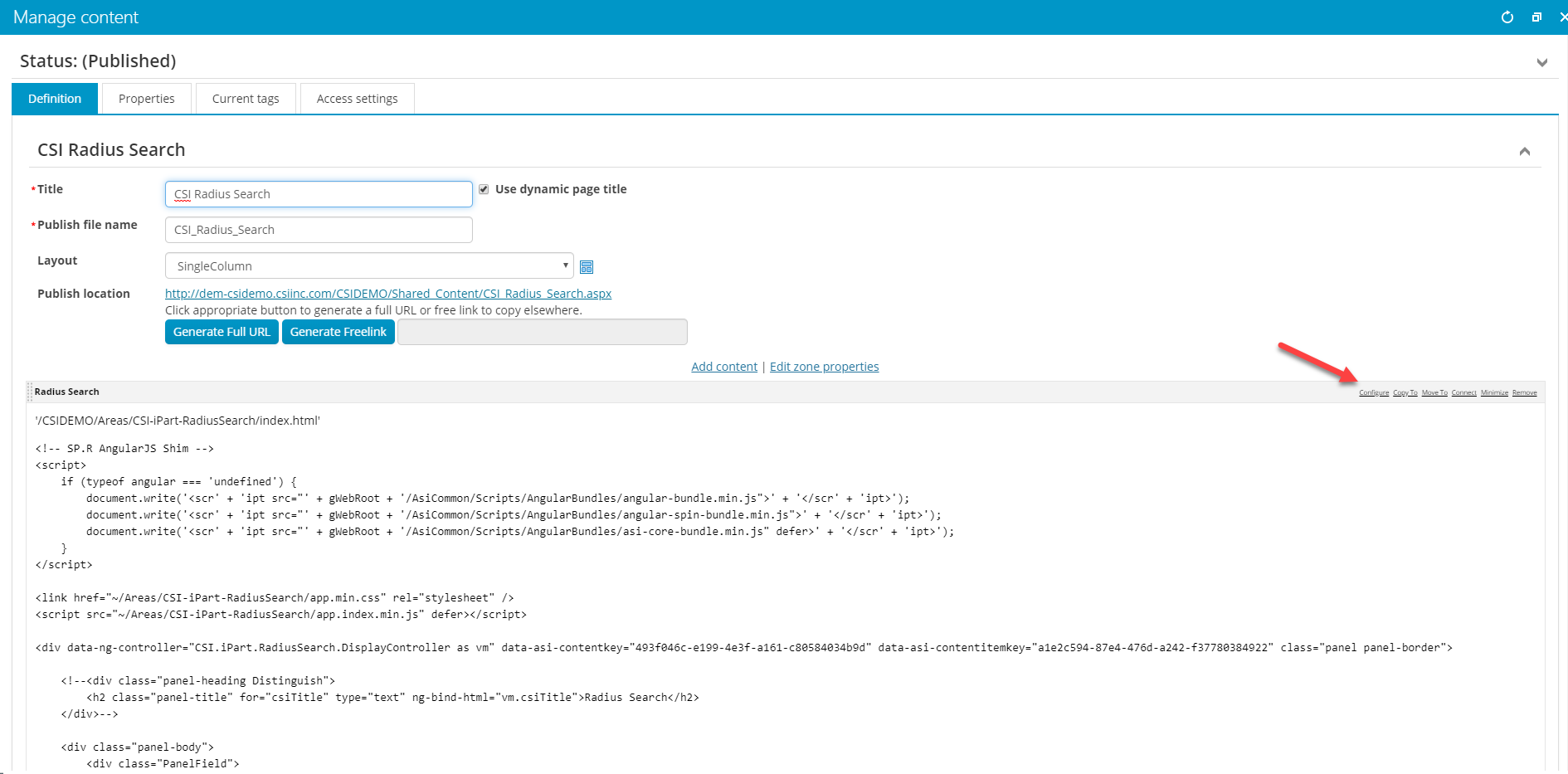 The iPart is now ready to be dropped on to a content page. After the Radius Search iPart is on the content page, click on the Configure link to open the iPart configuration screen to setup the Radius Search Settings