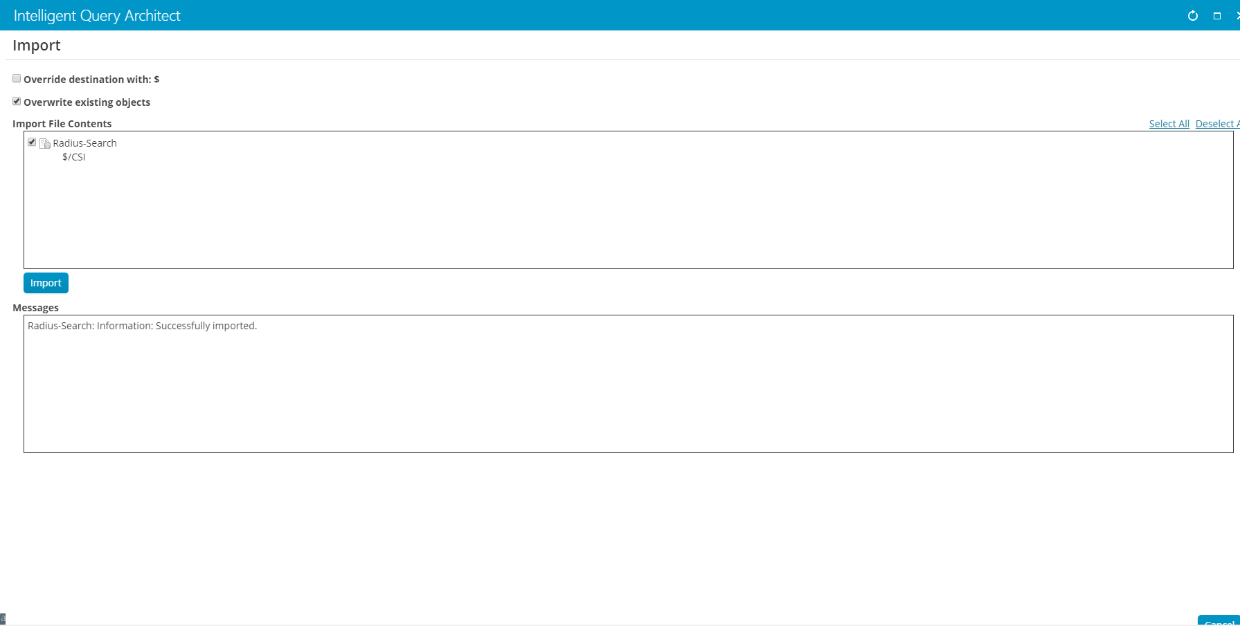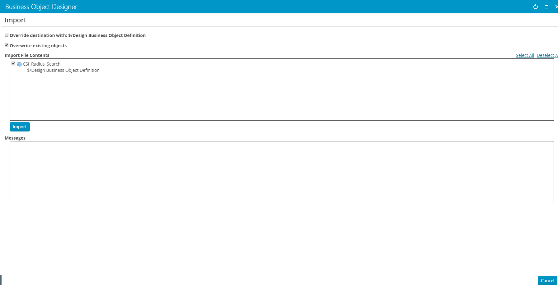 Click on Import and hit Select to navigate to the CSI_Radius_Search (Business Object).xml file.
