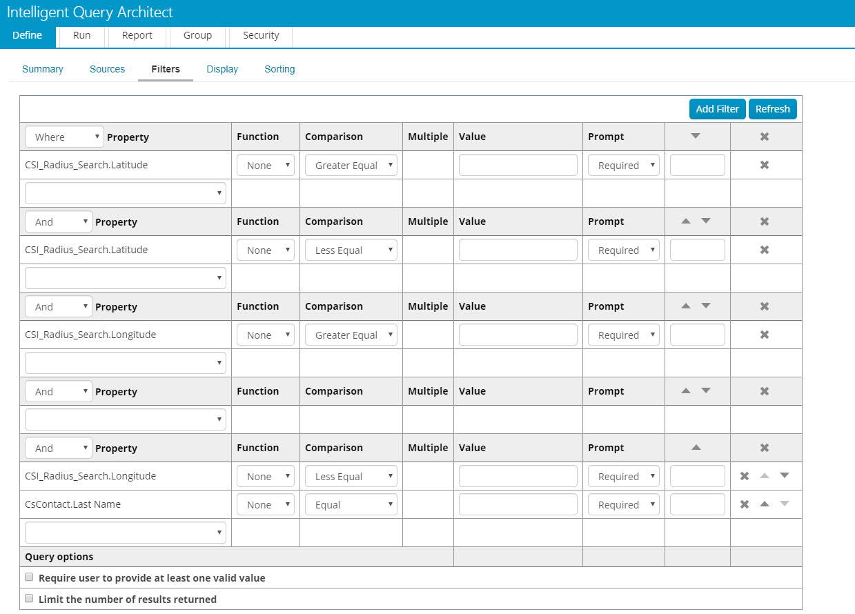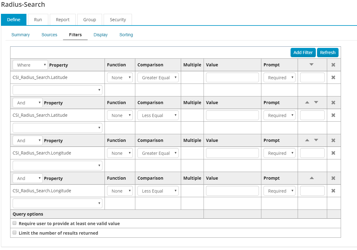 In the Filters sub-tab, you will notice four predefined filters. These are Latitude and Longitude filters that must be left in the query for it to work as intended. These filters are essential for the Radius Search iPart – THEY SHOULD NOT BE CHANGED OR DELETED.
