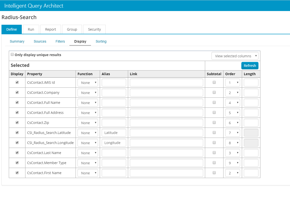 The Display sub-tab has two fields required for the iPart to work correctly, Latitude and Longitude. These display fields SHOULD NOT BE ALTERED. These fields will not be displayed in the results.