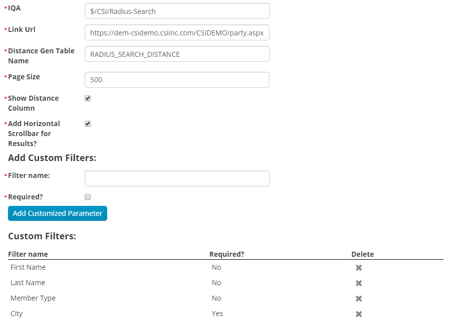 Page Size - Allows configuration the number of results displayed per page when using the Radius Search iPart.