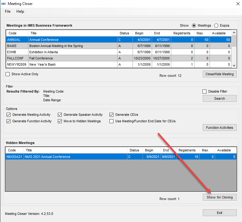 Do this by selecting all events in the Hidden Meetings section (you can use Ctrl-A), and clicking the Show for Cloning