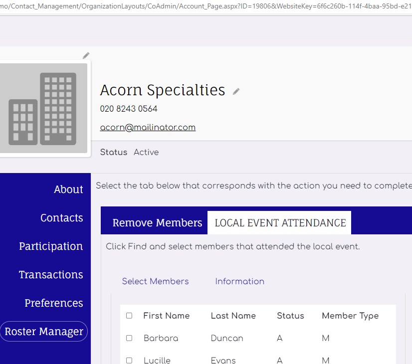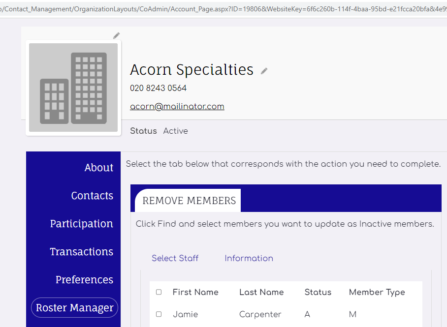 The roster manager iPart has been added to a tab within the Organization Profile which allows me to use the iMIS ID of the organization in the URL