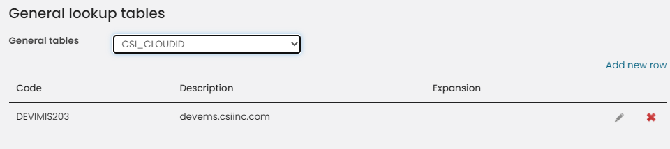 Note: If you have multiple domain names that need to refer to the same CSI Cloud ID instance you can add another general lookup entry in the CSI_CLOUDID table and use the Expansion field to store the CSI Cloud ID. In this case the Code value will be discarded, and the Expansion value will be substituted instead. For example:Code = DEVIMIS203A
