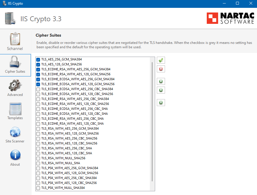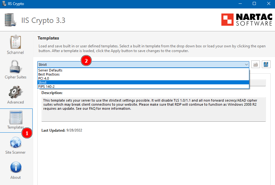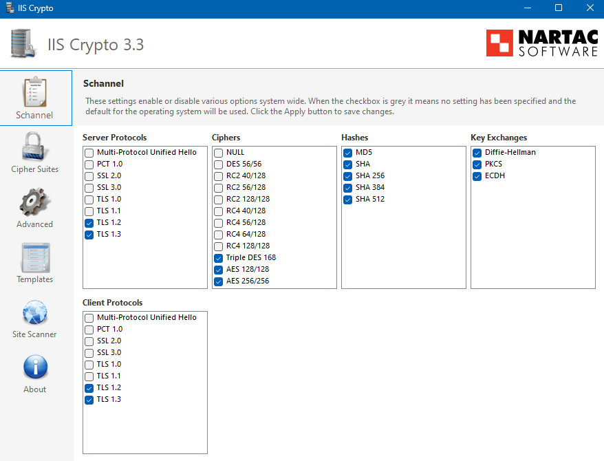 Alternatively, IIS Crypto ships with a secure template that automatically configures the server for TLS 1.2 and 1.3 and related ciphers, while disabling TLS 1.1 and lower.